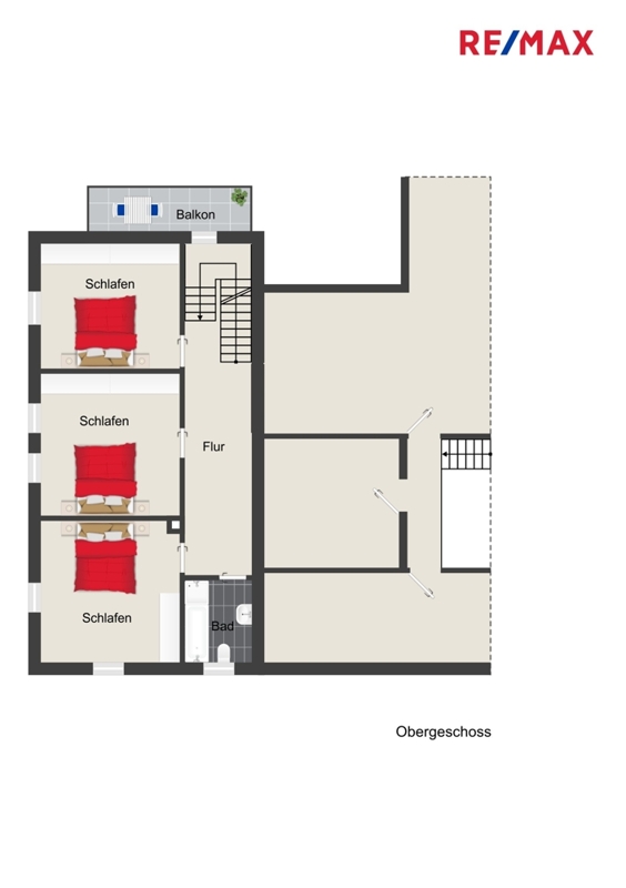 Im Obergeschoss finden Sie drei weitere großzügige Schlafzimmer sowie ein helles Badezimmer.