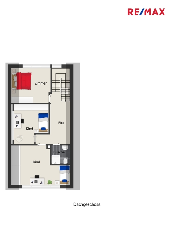 Das Dachgeschoss bietet drei weitere lichtdurchflutete Kinderzimmer sowie ein weiteres Badezimmer.
