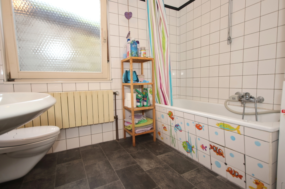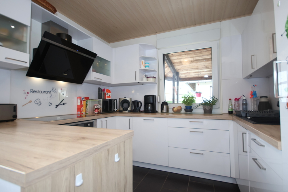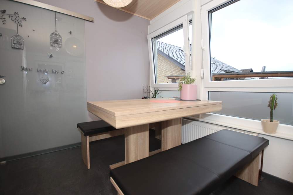 Von hier aus erreichen Sie direkt den offen gestalteten Ess- und Kochbereich. Die neuwertige Küche aus dem Jahr 2017 gehört zu dem Angebot dazu und lässt so manche Herzen höherschlagen. Durch eine Schiebetür getrennt, gelangen Sie in das gemütliche Wohnzimmer. Des Weiteren finden Sie im Erdgeschoss zwei großzügige Kinderzimmer, ein Badezimmer mit einem Waschmaschinenanschluss und ein Gäste-WC.