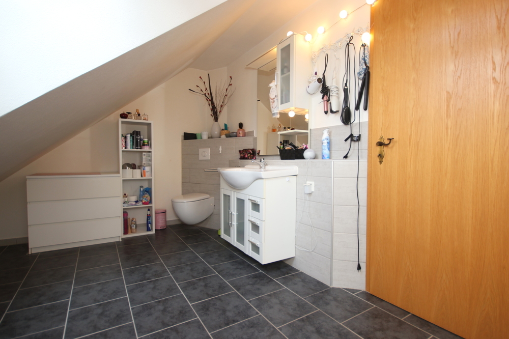 Im Dachgeschoss finden Sie ein großes Elternschlafzimmer mit einem urigen Kaminofen, ein Arbeitszimmer sowie ein weiteres Badezimmer.