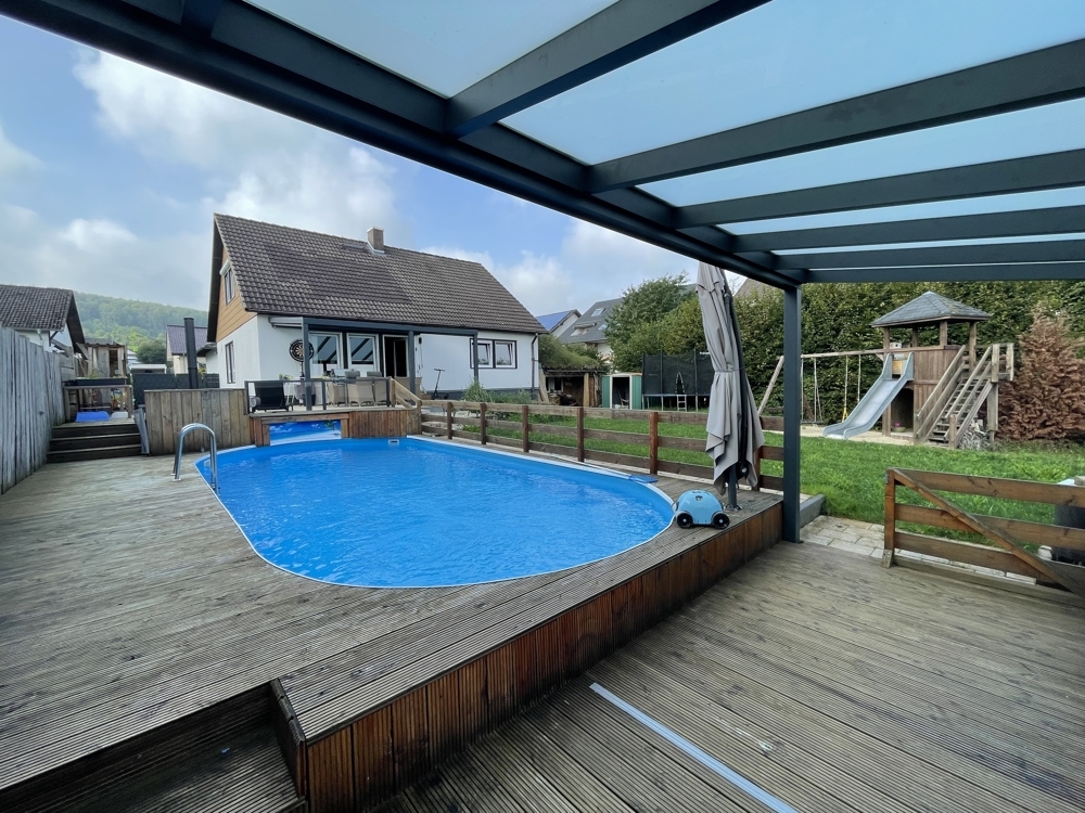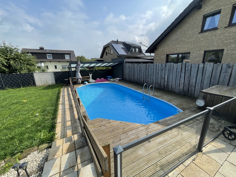 Der Pool, der 2019 gebaut wurde, ausgestattet mit einer Sandfilteranlage, ist das Highlight dieser Immobilie. Damit ist beste Laune an heißen Sommertagen garantiert.