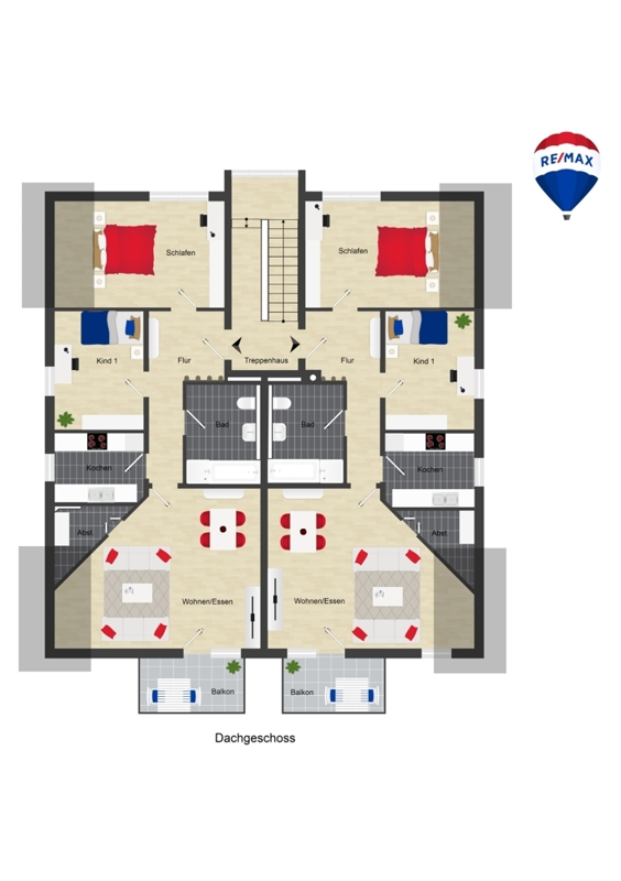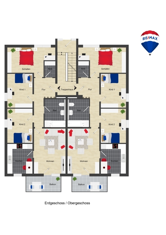 Das Mehrfamilienhaus verfügt über je zwei Wohneinheiten pro Etage. Im Erd- und Obergeschoss befinden sich 4-Zimmerwohnungen mit je ca. 90,84 qm Wohnfläche. Im Dachgeschoss verfügen die Wohnungen über 3 Zimmer mit je insgesamt ca. 77,14 qm Wohnfläche. Alle Wohnungen besitzen einen Balkon oder eine Terrasse.