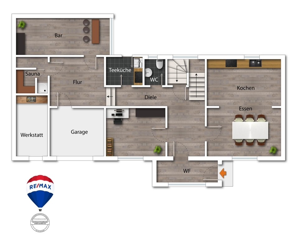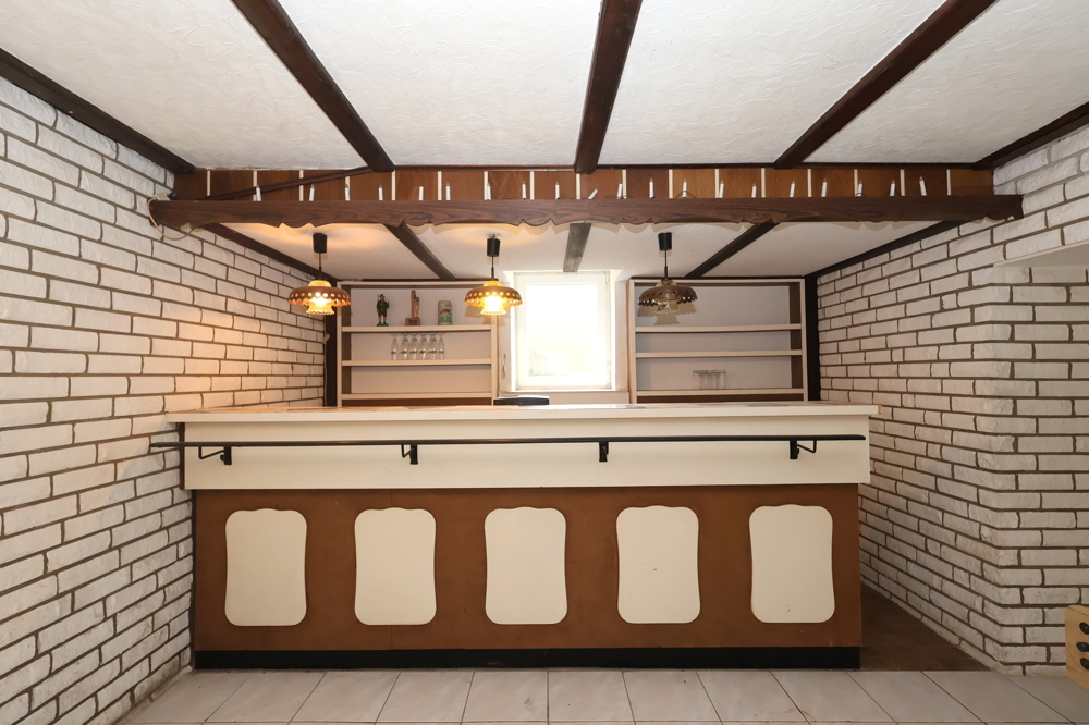 Im Erdgeschoss gelangen Sie über den Windfang, in den Wohnbereich. Hier befindet sich ein einladendes Esszimmer mit angrenzender Küche. Hier ist ein Kamin angeschlossen, der auch an kalten Tagen für ein wohlige Wärme im gesamten Haus sorgt. Außerdem finden Sie auf dieser Etage ein geräumiges Arbeitszimmer, ein Gäste-WC und einen praktischer Hauswirtschaftsraum. Des Weiteren bietet das Erdgeschoss ein Partyraum mit dazugehöriger Bar und eine Sauna sowie eine Dusche, die Entspannung garantiert.