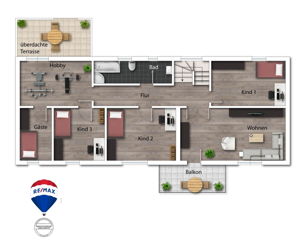 Hier befindet sich ein gemütliches Schlafzimmer, zwei Kinderzimmer, ein Gästezimmer, ein großzügiges Tageslichtbad mit einer Dusche und einer Badewanne, ein großzügiger Wohnbereich mit einem Zugang zum Balkon sowie einen Hobbyraum mit Zugang zur überdachten Terrasse.