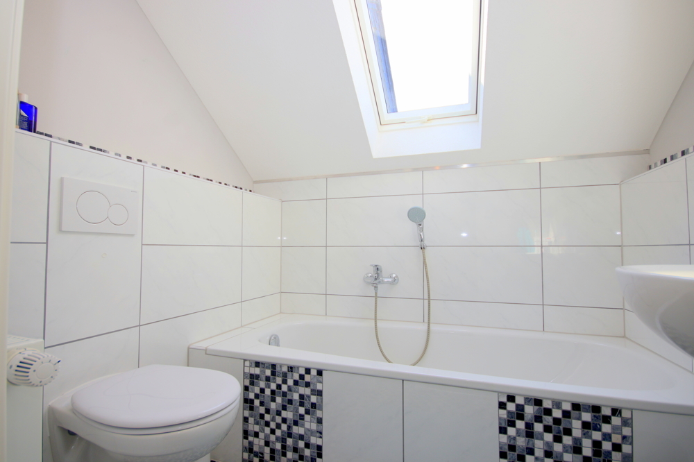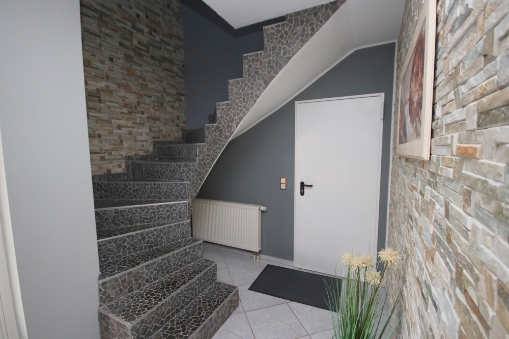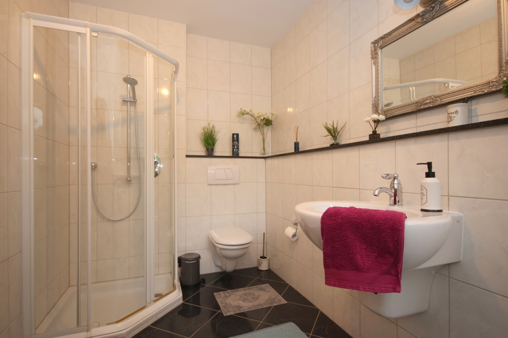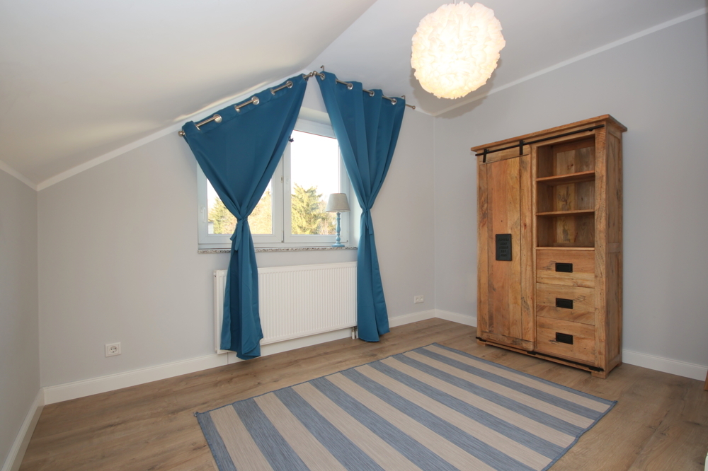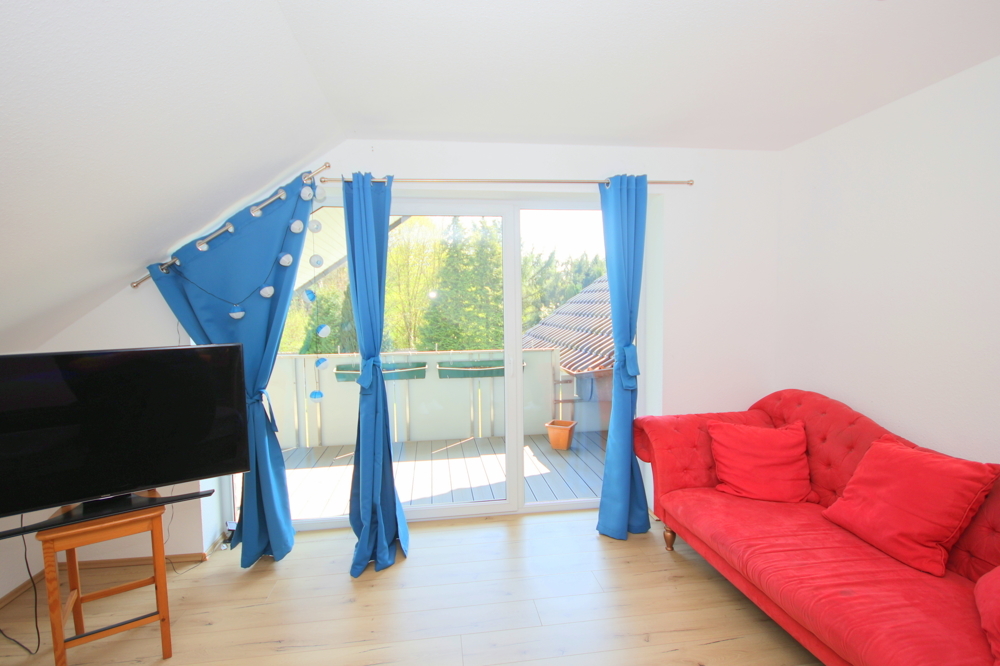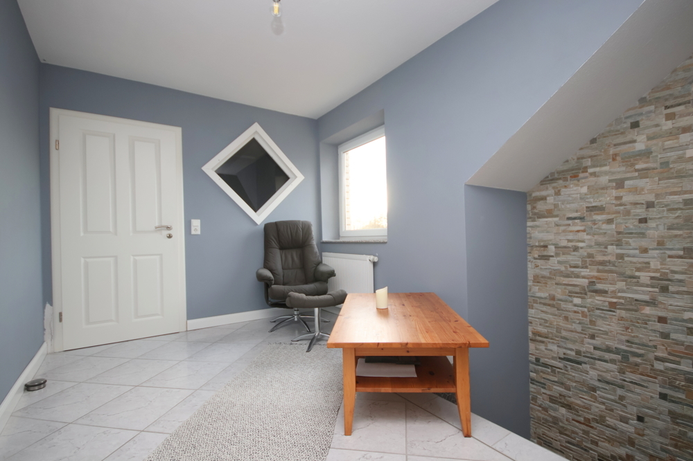 Die nachträglich ausgebaute Einliegerwohnung befindet sich im Dachgeschoss des Hauptgebäudes und bietet auf ca. 64 m², die zur ursprünglichen Wohnfläche hinzukommen, eine elegante und gemütliche Unterkunft. Mit eigenem Zugang vom Treppenhaus stellt sie eine perfekte Möglichkeit für Gäste, Familienangehörige oder eine potenzielle Vermietung dar. Der großzügige, offene Wohnbereich mit viel Tageslicht schafft eine angenehme und einladende Atmosphäre.