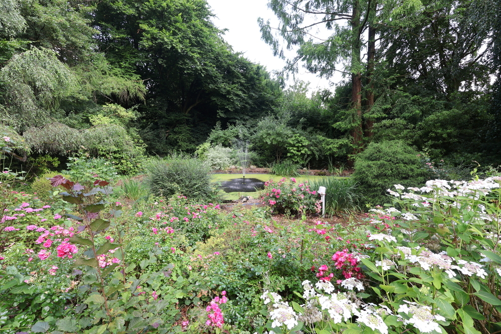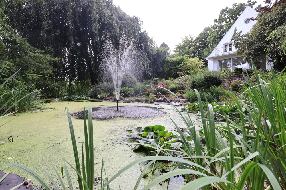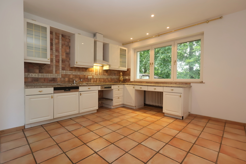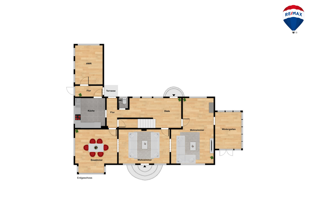 Im Erdgeschoss erwartet Sie ein offenes Treppenhaus sowie ein großzügiger Wohnbereich in L-Form, ausgestattet mit einem Kachelofen. Durch eine hochwertige Schiebetür wird der Wohnbereich vollendet, diese Räumlichkeit bietet eine Kaminkassette, der zum Verweilen mit Familie und Freunden einlädt. Das angrenzende, helle Esszimmer bietet den idealen Rahmen für gesellige Abende. Die geräumige Küche überzeugt mit guter Ausstattung und Funktionalität. Ergänzt wird das Erdgeschoss durch ein Gäste-WC, eine durchdachte Garderobe, einen Hauswirtschaftsraum sowie einen Wintergarten mit Blick und Zugang zum stilvollen Springbrunnen. Die angrenzende Terrasse eröffnet einen herrlichen Blick in den weitläufigen Garten.