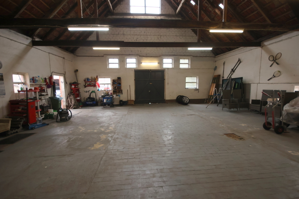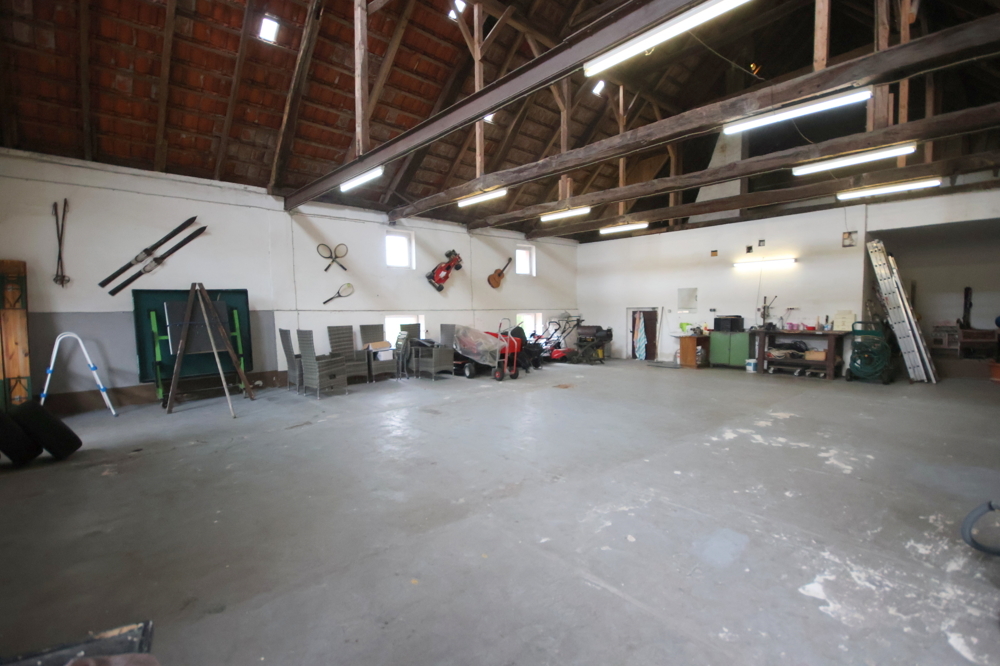 Direkt hinter dem Haupthaus befindet sich eine ca. 140 m² große Halle, die vielfältige gewerbliche Nutzungsmöglichkeiten eröffnet. Ein großzügiger Innenhof bietet weitere Stell- und Arbeitsflächen.