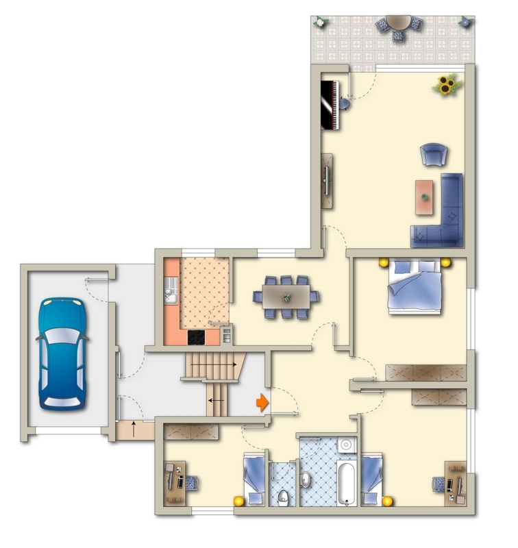 Im Erdgeschoss befindet sich ein sehr geräumiges Wohnzimmer sowie eine Küche mit angeschlossenem Esszimmer, weiterhin drei Schlafräume, ein Bad und ein WC.