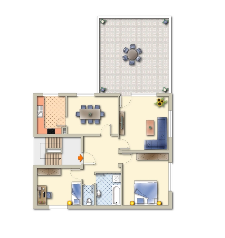Das Obergeschoss bietet ein Wohnzimmer, eine Küche mit Esszimmer sowie zwei Schlafzimmer, Bad und WC an.