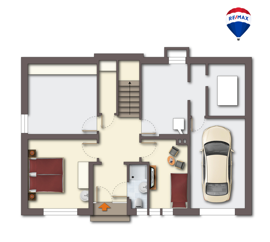 Unbedingt erwähnt werden sollte noch die geräumige Garage, die sich mit im Haus befindet und von der Sie witterungsgeschützt in das Untergeschoss gelangen.