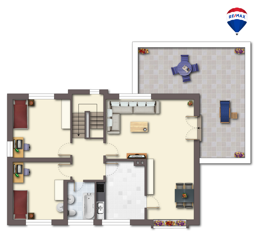 Neben zwei Schlafzimmern gibt es hier die Küche, das Wohnzimmer und ein Badezimmer.