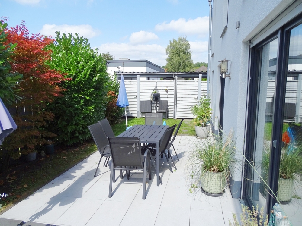 Die Terrasse ist mit hellem Betonstein belegt und der Garten ist pflegeleicht angelegt.