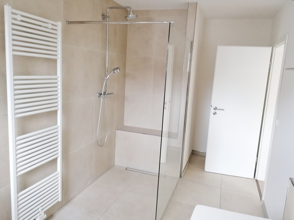 Das ansprechende Badezimmer verfügt über eine flache Dusche mit Glasabtrennung und einem sehr schönen Einbauwaschtisch.