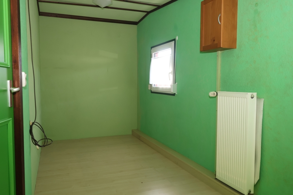 Dieses Wohnmobilheim bietet ein gemütliches Wohnzimmer, ein Arbeitszimmer, eine Küche und ein Schlafzimmer sowie ein kleines aber feines Badezimmer.